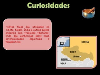 As taças tibetanas são instrumentos musicais antigos utilizados na cura através do som há mais de 5000 anos. Produzem vibrações que promovem relaxamento profundo, equilíbrio emocional e físico, e aumentam a criatividade e auto-estima. São feitas manualmente de metais como cobre, ouro e prata e emitem sons que purificam a mente e corpo.