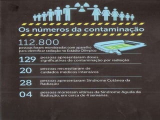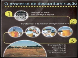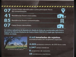 O documento descreve o acidente radioativo de Goiânia em 1987, quando resíduos de césio-137 foram encontrados em um instituto de radioterapia e acabaram sendo levados para um ferro-velho, contaminando várias pessoas que tiveram contato com o material radioativo e desenvolveram sintomas de intoxicação.