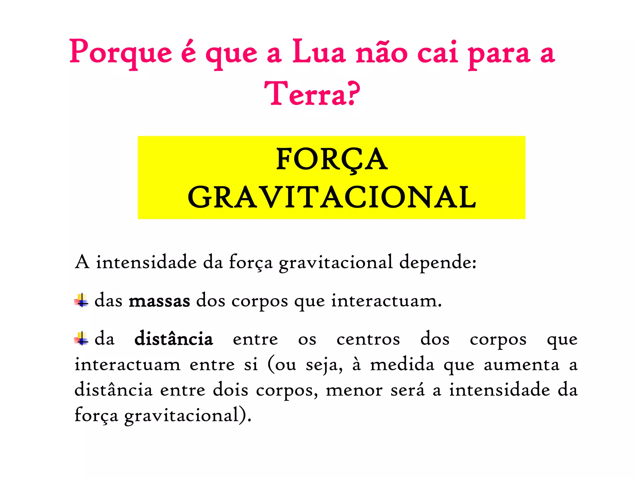 A Lua não cai para a Terra devido à força gravitacional entre os dois corpos, que mantém a Lua em órbita ao redor da Terra. As marés oceânicas são causadas pelas forças gravitacionais combinadas da Lua e do Sol, sendo a influência da Lua aproximadamente o dobro da do Sol. As marés são maiores nas fases de Lua Cheia e Lua Nova quando os três corpos estão alinhados, e menores nas fases de Quarto Minguante e Quarto Crescente.