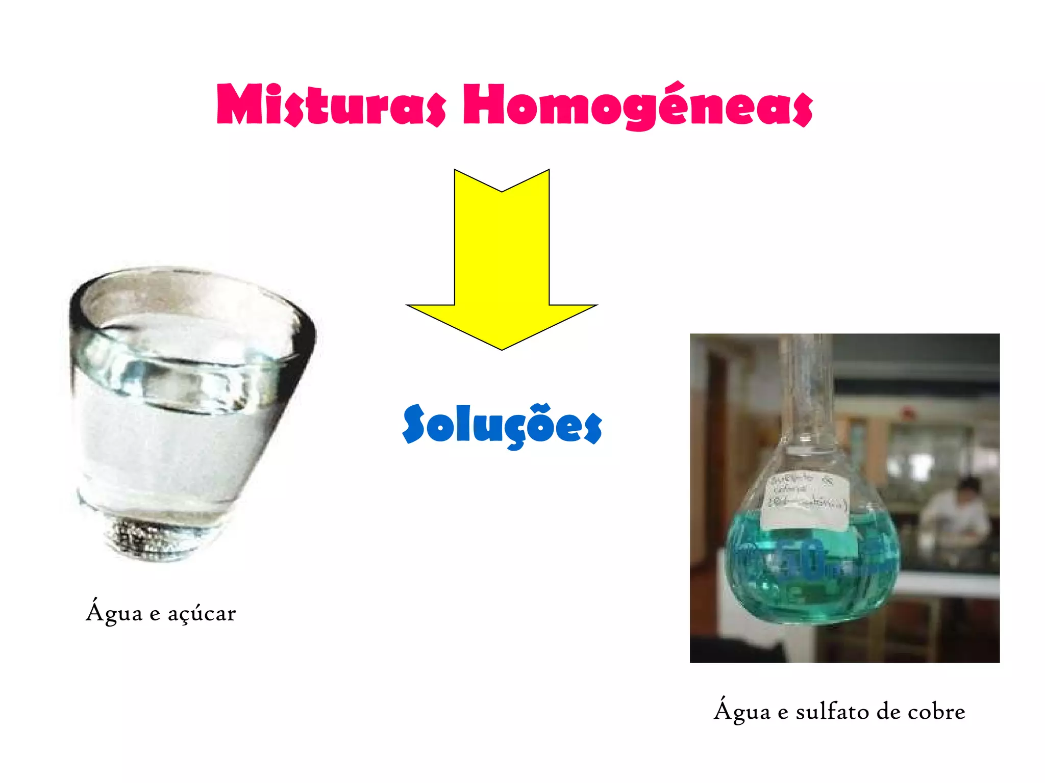O documento discute misturas homogêneas e soluções, definindo soluto como a substância que se dissolve e solvente como a substância que dissolve o soluto. Ele fornece exemplos como água e açúcar e água e sulfato de cobre como soluções, e explica que a água é o solvente e o sal é o soluto na solução água salgada.