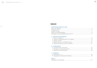 Este relatório apresenta as principais atividades e resultados da Caixa Geral de Depósitos no âmbito da sustentabilidade em 2015, abordando os temas de negócio responsável, comunidade e ambiente. Inclui informações sobre a estratégia, gestão e desempenho da empresa nestas três áreas, resultados de uma consulta a stakeholders e indicadores quantitativos.