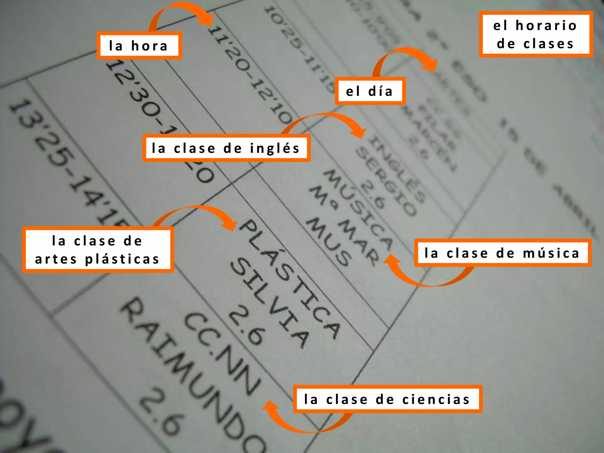 Este documento lista elementos relacionados ao horário escolar e ao calendário, incluindo aulas, edifícios do campus, horário de aulas, calendário com dias e meses. Também inclui exemplos de horas e números.