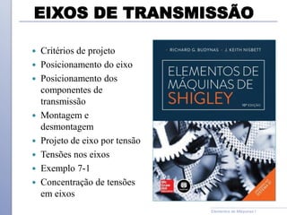 O documento descreve os critérios e métodos de projeto de eixos de transmissão. Discute como posicionar os componentes ao longo do eixo e como projetar o eixo para resistir às tensões causadas por torção e flexão. Também aborda como estimar concentrações de tensão e dimensionar o eixo para limites de deflexão.