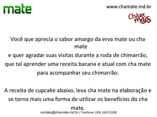 O documento apresenta uma receita de cupcake que utiliza chá mate na elaboração, oferecendo uma forma criativa de aproveitar os benefícios da erva. Os ingredientes incluem açúcar, ovos, farinha de trigo, erva-mate, água, óleo, fermento e leite condensado cozido. O preparo requer misturar os ingredientes, encher forminhas e assar em forno a 180°C entre 25 e 30 minutos.