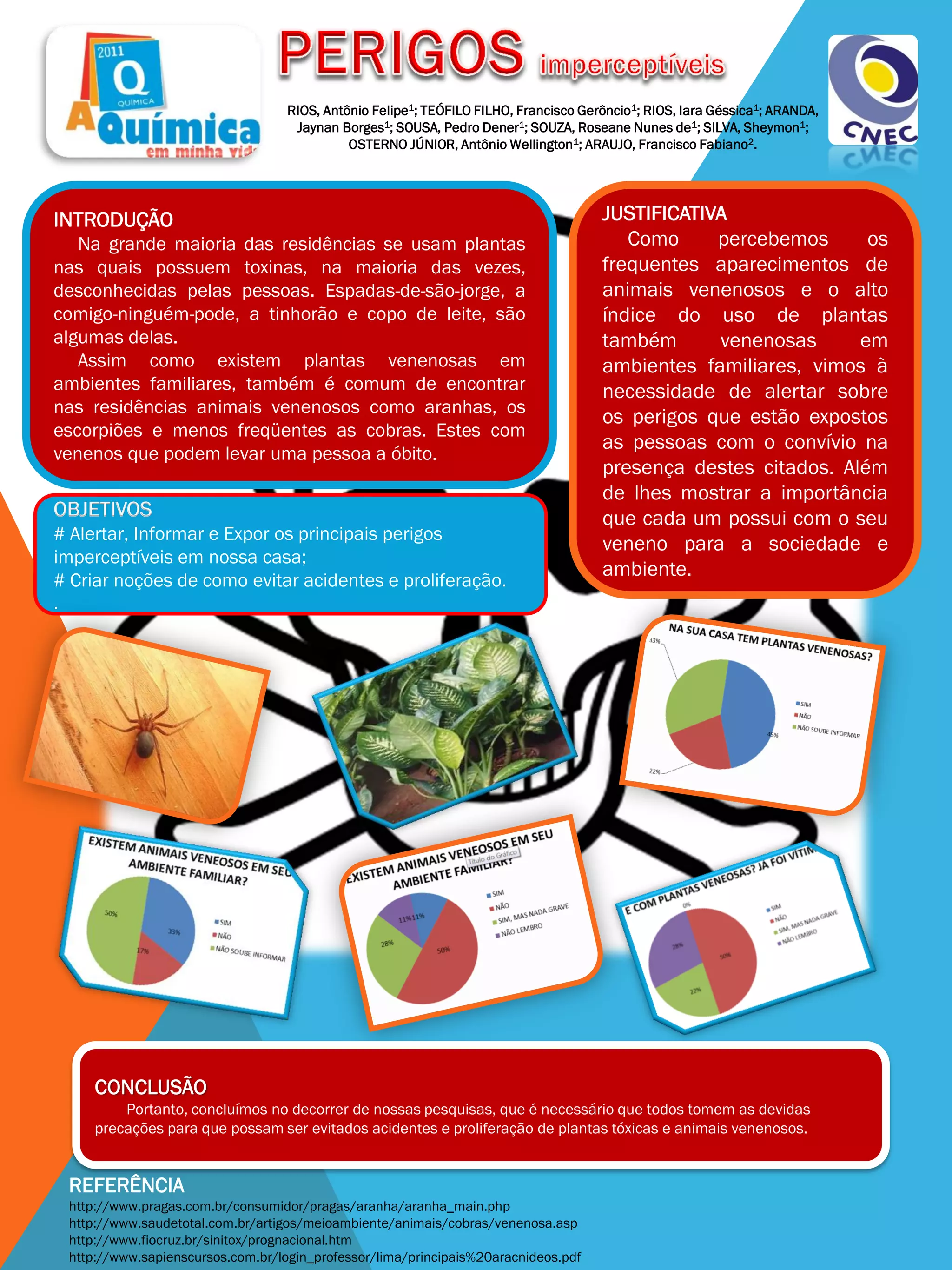 O documento discute os perigos de plantas e animais venenosos encontrados em residências, como espada-de-são-jorge, aranhas e escorpiões. Ele visa alertar sobre esses perigos e como evitar acidentes, bem como prevenir a proliferação desses organismos.