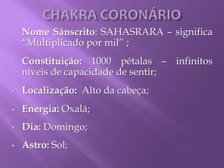 O chakra Sahasrara ou coronário é o sétimo e último chakra localizado no alto da cabeça. É associado à espiritualidade, à ligação com o divino e à transcendência. Sua cor é o violeta e sua função é irradiar a consciência humana para conectá-la com a energia divina e assimilá-la nos demais chakras.