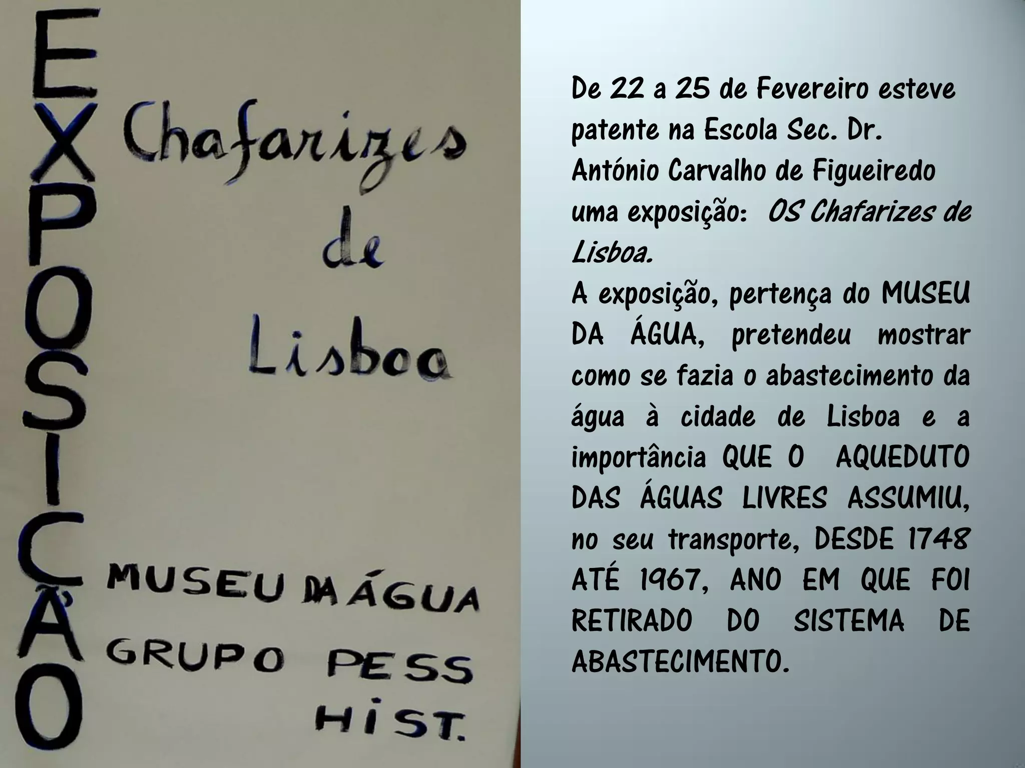 A exposição mostrou como Lisboa era abastecida de água através dos chafarizes ao longo dos séculos, desde as nascentes naturais até à construção do Aqueduto das Águas Livres em 1748, que transportava a água da zona de Belas para a cidade. A água era distribuída pela população através de galerias e chafarizes localizados em diferentes pontos de Lisboa. Alunos puderam aprender sobre vários chafarizes importantes e a história do abastecimento de água na cidade.