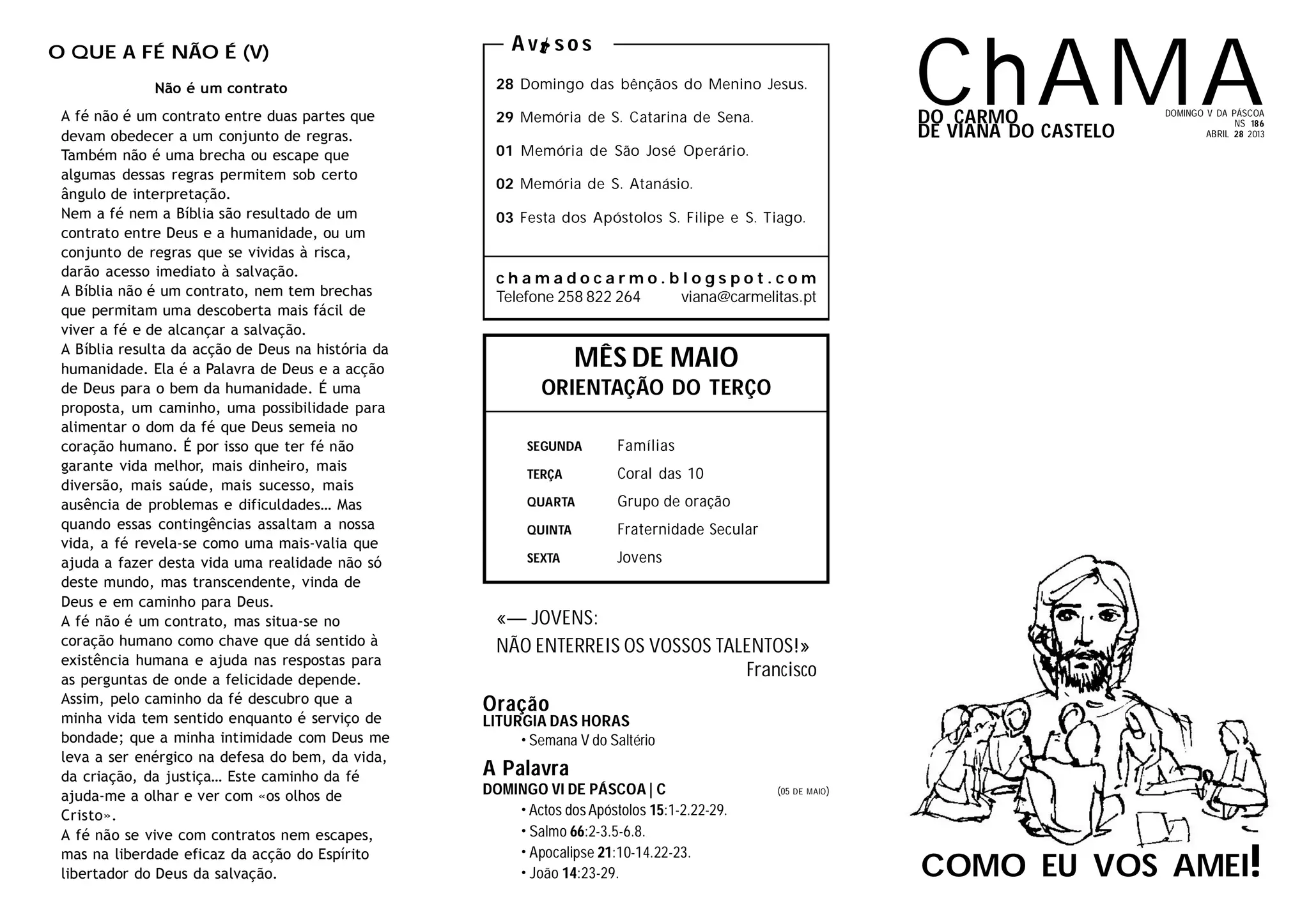 Este documento fornece informações sobre eventos religiosos em uma igreja católica, incluindo missas, orações e reflexões. Ele discute o mandamento de Jesus para que seus discípulos se amem uns aos outros e reflete sobre como viver segundo este mandamento através do amor genuíno e do serviço aos outros.