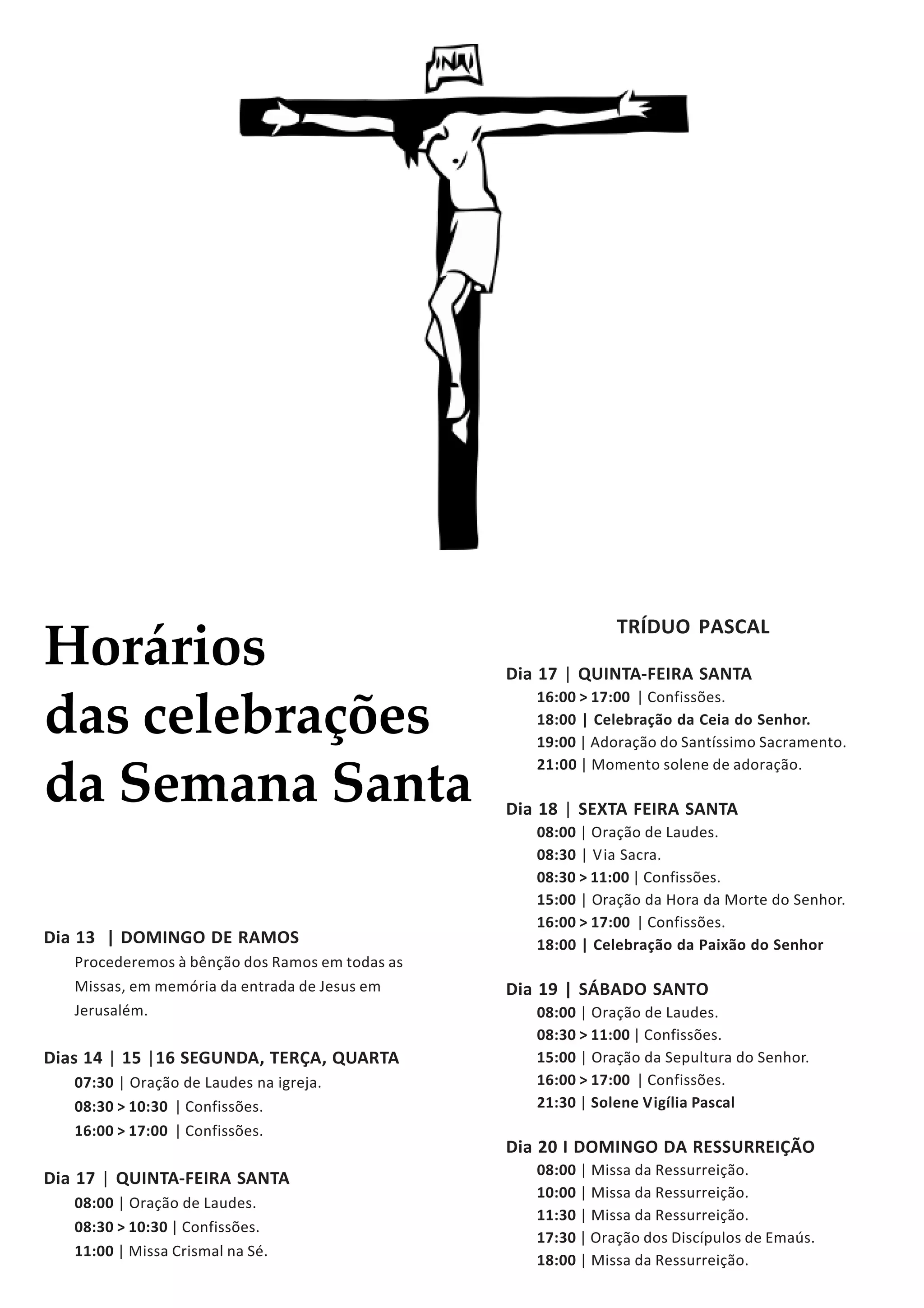 O documento lista os horários das celebrações religiosas da Semana Santa, incluindo a bênção dos Ramos no Domingo de Ramos, a Ceia do Senhor e adoração na Quinta-Feira Santa, a Via Sacra e Paixão do Senhor na Sexta-Feira Santa, a Vigília Pascal no Sábado Santo e as missas da Ressurreição no Domingo de Páscoa.
