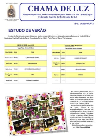 Este boletim informativo da União Distrital Espírita Passo D’ Areia contém informações sobre os Estudos de Verão de 2012 em uma Sociedade Espírita, um editorial sobre a transição para um novo planeta e uma nova era, e sobre as atividades de encerramento do ano de três Sociedades Espíritas que incluíram almoços, piqueniques e momentos de confraternização.