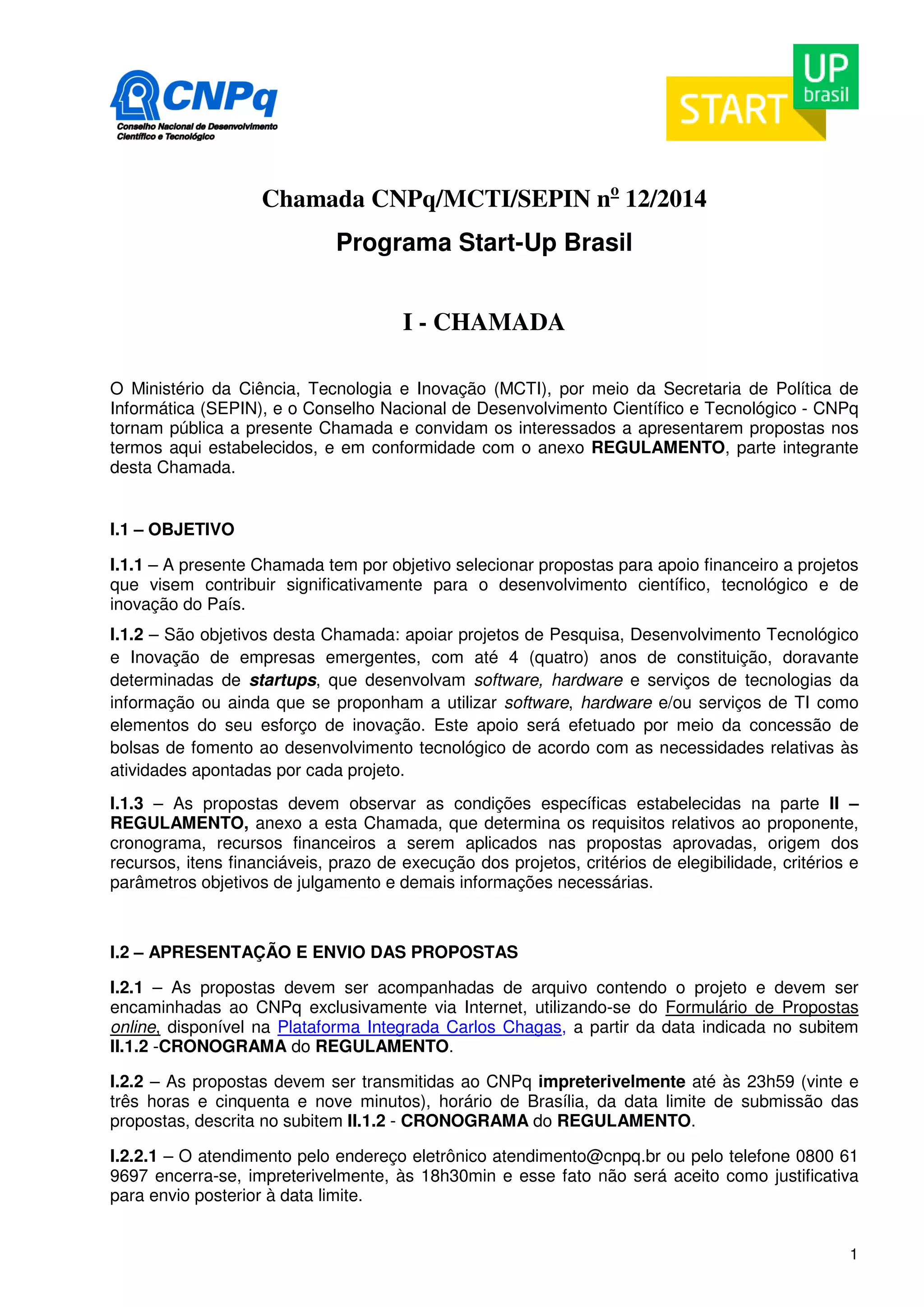 Este documento apresenta a Chamada CNPq/MCTI/SEPIN nº 12/2014, do Programa Start-Up Brasil, que visa selecionar e financiar propostas de startups para desenvolvimento científico, tecnológico e inovação. As propostas devem ser submetidas online, respeitando prazos e critérios técnicos especificados no regulamento anexado. A seleção será realizada em etapas, com análises e julgamentos por comitês técnicos e a aprovação final pela diretoria executiva do CNPq.