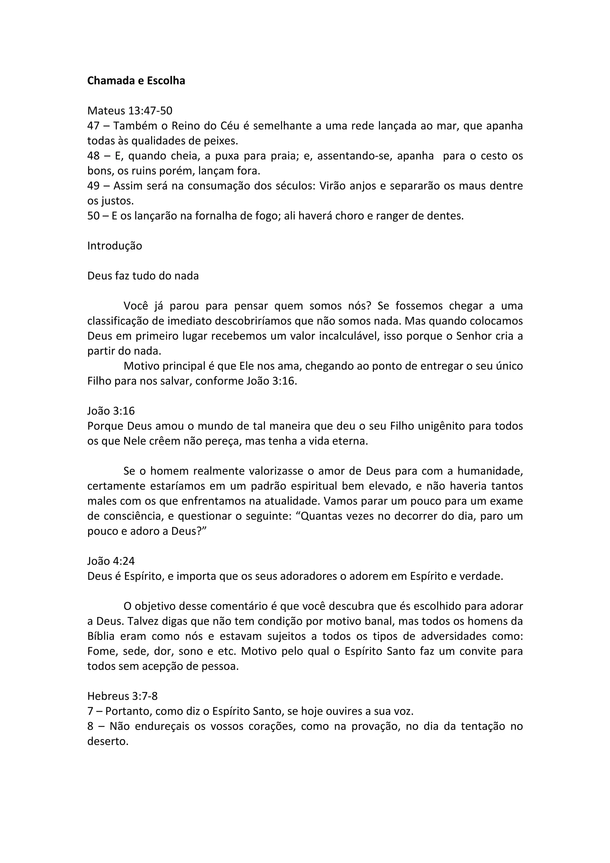 O documento discute vários exemplos bíblicos de indivíduos que foram chamados por Deus para servir em Sua obra, incluindo Moisés, Samuel, Isaías, Jeremias e Jonas. Também discute como Jesus chamou os doze apóstolos e como Saulo de Tarso foi chamado enquanto perseguia os cristãos. O objetivo é enfatizar que Deus continua chamando as pessoas hoje para que sirvam a Ele.