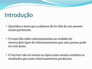 O texto discute dois tipos de relacionamentos com Jesus: 1) permanecer nele para dar muito fruto ou 2) não permanecer e secar. Jesus chama seus discípulos de amigos ao invés de servos porque amigos conhecem os planos de seu Senhor. O objetivo é que tenhamos um relacionamento de amizade com Deus ao invés de um relacionamento religioso.