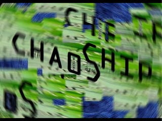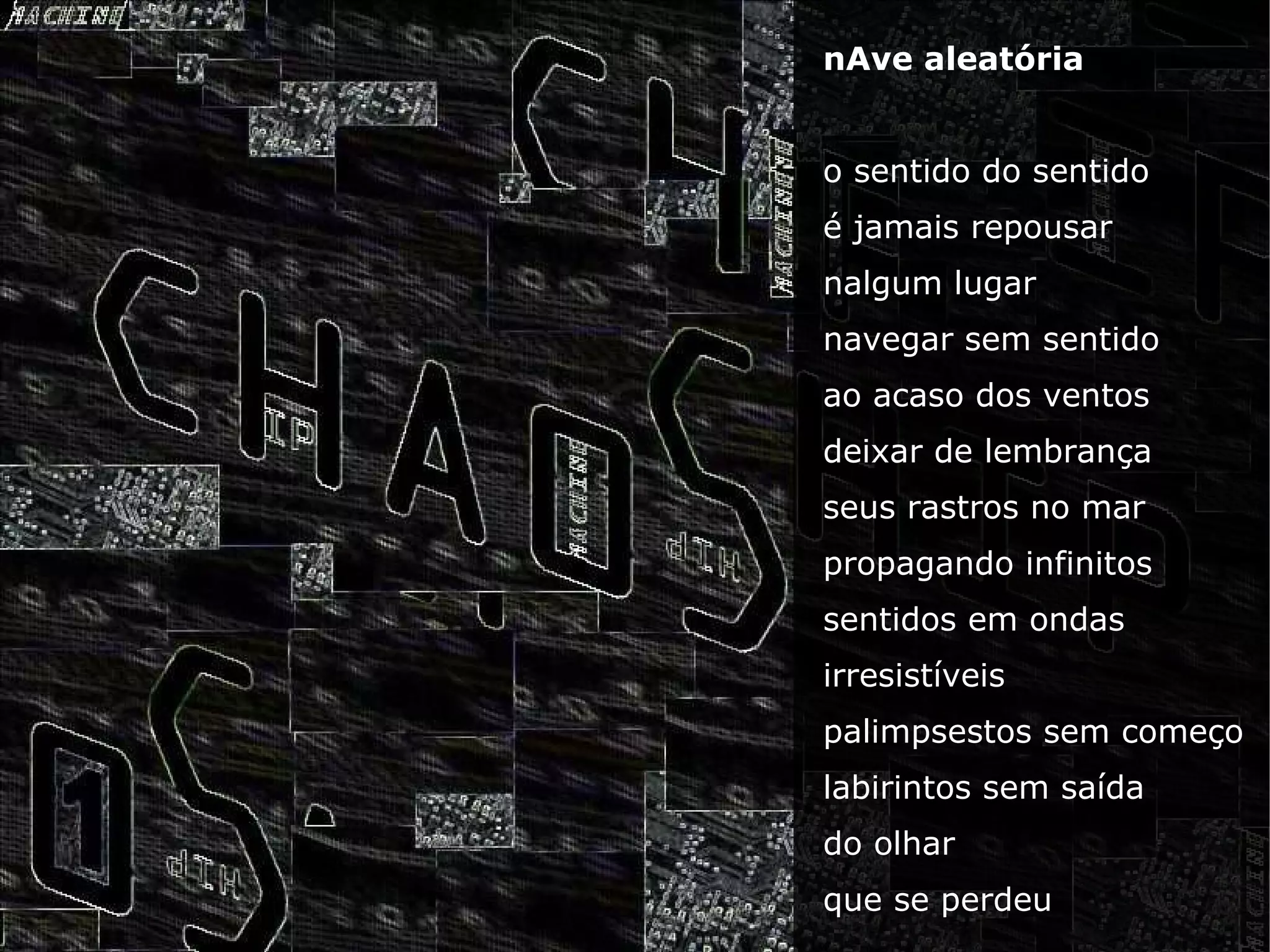Este slide-poema explora temas de aleatoriedade, simulacros e dissolução da identidade. É composto por imagens e textos que descrevem uma jornada sem rumo através de um mar de sentidos que se propagam e se replicam infinitamente, assim como almas que se desfazem e se dispersam em um cosmos em constante expansão e replicação.