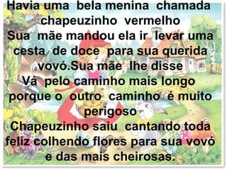 Chapeuzinho Vermelho foi visitar sua vovó levando doces, mas encontrou o lobo no caminho. O lobo chegou antes na casa da vovó e a prendeu. Quando Chapeuzinho chegou, o lobo se fingiu de vovó até ser descoberto e salvo por dois homens, que resgataram a vovó também. No final, Chapeuzinho e a vovó comemoraram juntas.