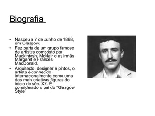 Charles Rennie Mackintosh foi um arquiteto, designer e pintor escocês do início do século XX conhecido por seu estilo único. Projetou vários edifícios notáveis em Glasgow, como a Escola de Artes de Glasgow e a casa Hill House. Embora tenha recebido reconhecimento na Europa, sua carreira declinou na Escócia devido à dificuldade em obter projetos públicos e clientes para seu estilo singular. Passou seus últimos anos dedicando-se à pintura na França.