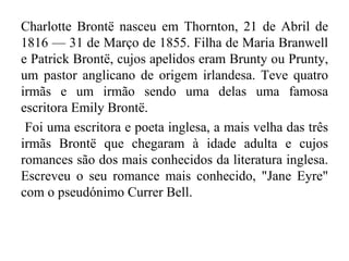Charlotte Brontë nasceu em 1816 na Inglaterra e foi uma famosa escritora. Escreveu romances como "Jane Eyre" sob o pseudônimo Currer Bell. Teve cinco irmãos, incluindo Emily Brontë, também uma escritora. Passou parte da vida como professora e governanta antes de se dedicar à literatura. Faleceu em 1855 durante a gravidez do seu primeiro filho.