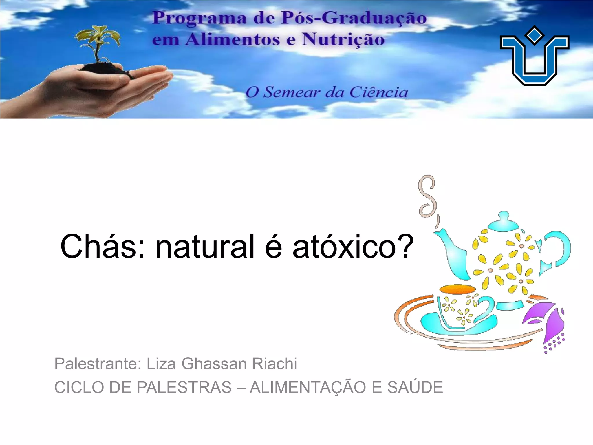 A palestra discute a história e origem do chá, seus tipos e benefícios à saúde. No entanto, enfatiza que o chá deve ser consumido com moderação e sob orientação profissional, já que em excesso pode se tornar tóxico, especialmente quando se trata de ervas medicinais. A legislação brasileira regulamenta a produção e comercialização de chás.