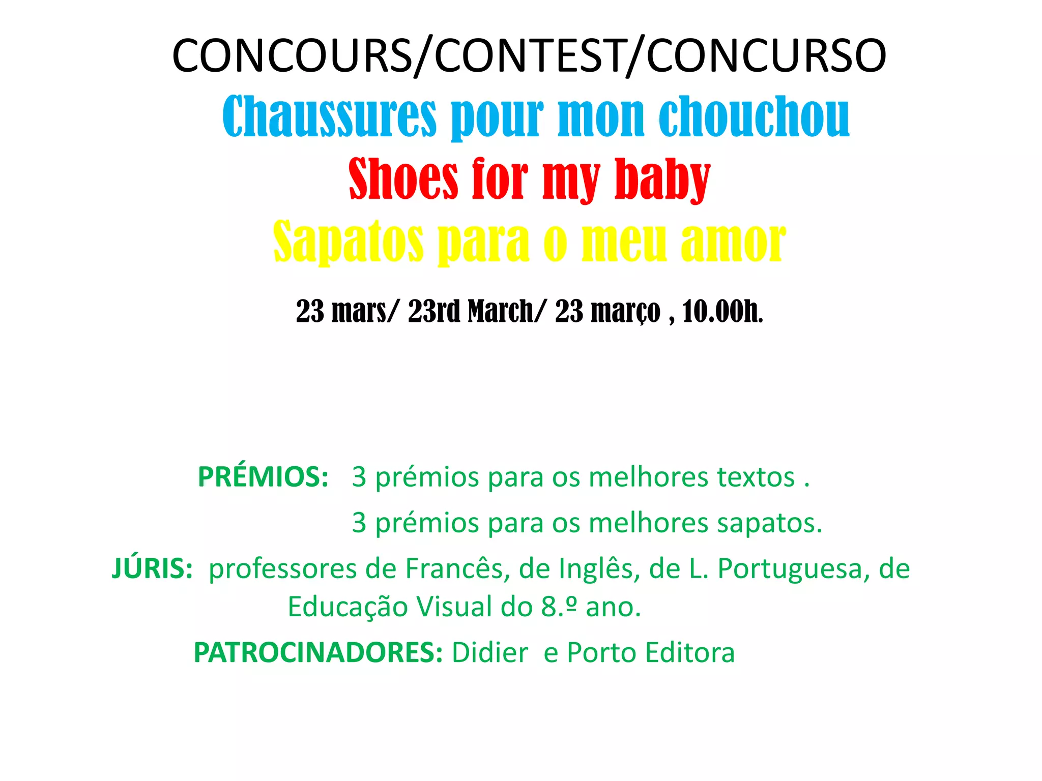 Um concurso de sapatos e textos para crianças do 8o ano será realizado em 23 de março às 10h. Os alunos poderão enviar sapatos e textos criativos em francês, inglês ou português e 3 prêmios serão dados para os melhores em cada categoria por um júri de professores. O concurso é patrocinado pela Didier e Porto Editora.
