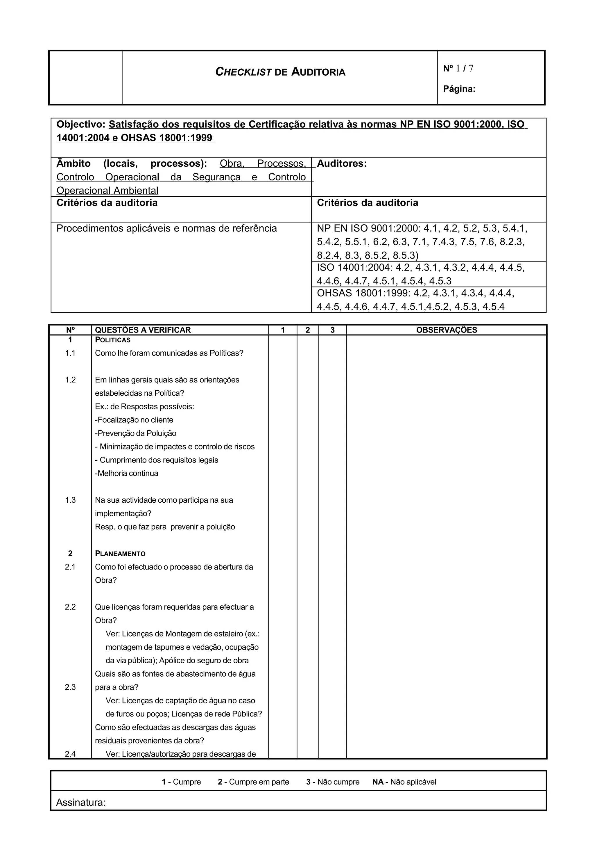 O documento apresenta uma checklist de auditoria com o objetivo de verificar o cumprimento dos requisitos de certificação de normas de qualidade, ambiente e segurança. A checklist contém questões sobre políticas, planeamento, produção, controlo operacional de ambiente e segurança, emergências, não conformidades e reclamações.