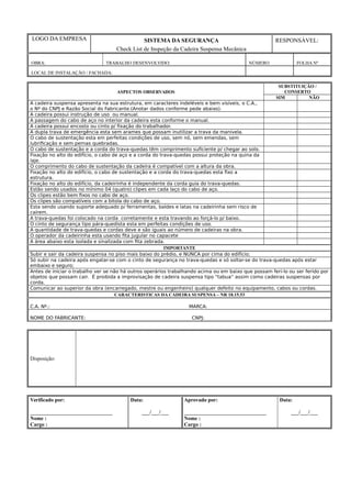 Este documento fornece uma lista de verificação para inspecionar cadeiras suspensas mecânicas em obras. Ele lista vários itens de segurança que devem ser verificados, como a estrutura da cadeira, cabos, travas de emergência, fixação e equipamentos de proteção individual. Qualquer defeito identificado deve ser comunicado imediatamente.