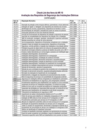 Este documento apresenta uma lista de verificação dos itens da Norma Regulamentadora NR 10, com as disposições normativas, prazos de adequação e classificação de conformidade. A lista inclui requisitos de segurança para instalações elétricas, projeto, operação e manutenção, qualificação de trabalhadores, áreas classificadas e sinalização.
