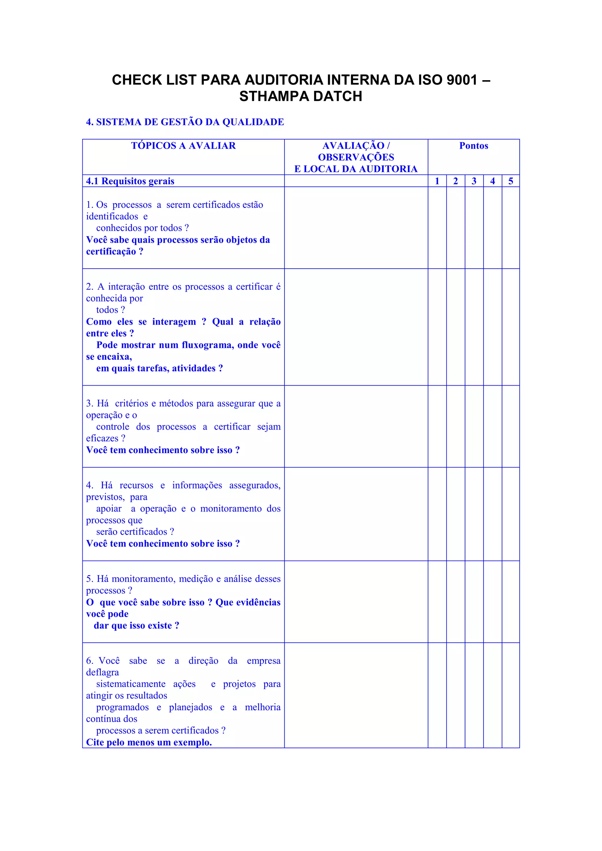 Este documento fornece uma lista de verificação para auditoria interna do sistema de gestão da qualidade ISO 9001. Ele avalia os requisitos gerais e de documentação, além da responsabilidade da direção. Verifica se os processos certificados são conhecidos e monitorados, e se há documentação como manual da qualidade e procedimentos definidos.