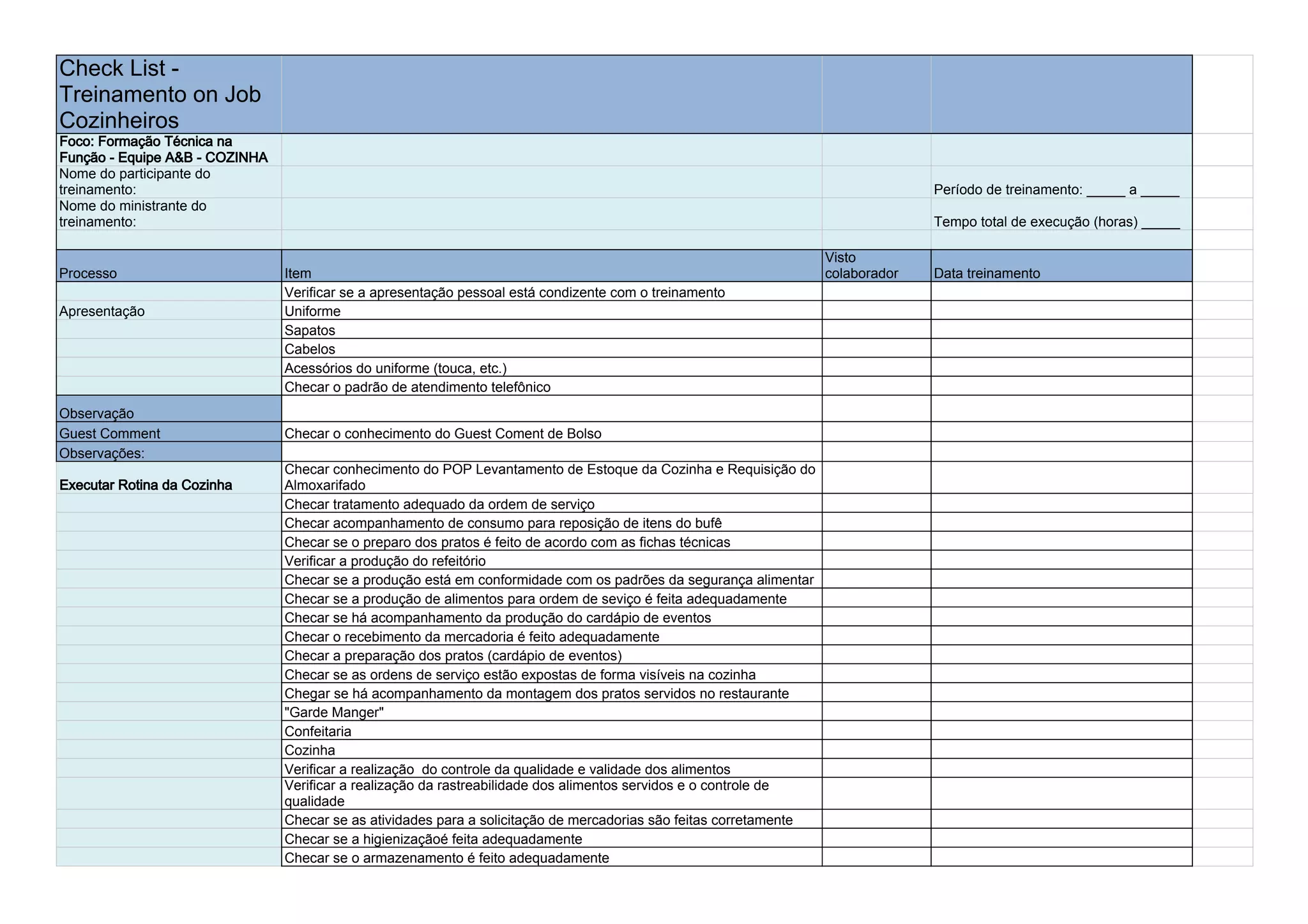 O documento é uma lista de verificação para o treinamento de cozinheiros e inclui itens como: apresentação pessoal, atendimento telefônico, execução de rotinas da cozinha, produção de alimentos, recebimento de mercadorias, controle de qualidade e validade de alimentos, higienização, armazenamento e manipulação de alimentos. O objetivo é garantir que os cozinheiros sejam treinados nos processos e padrões da cozinha.