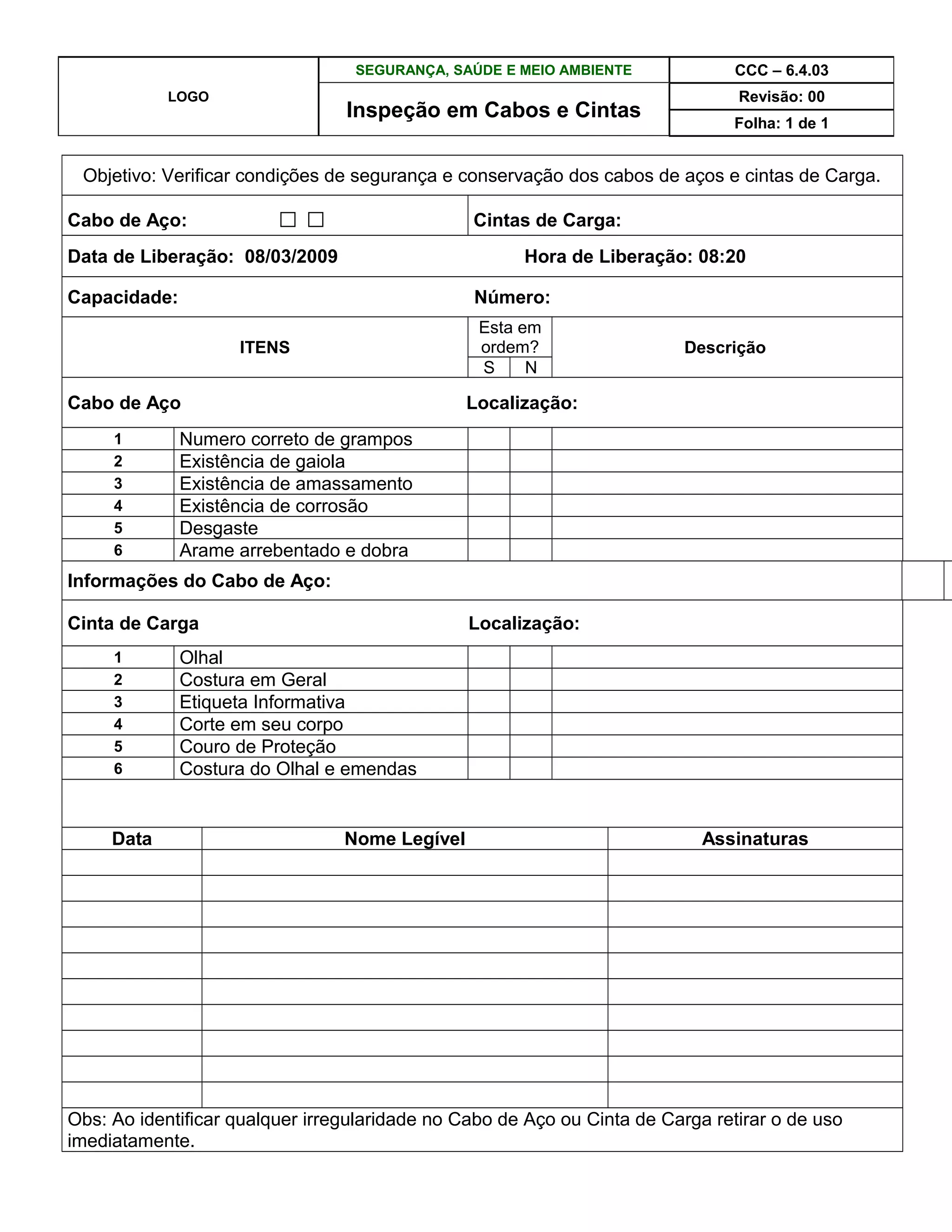 O documento descreve uma inspeção de segurança realizada em cabos de aço e cintas de carga para verificar seu estado e condições de conservação, listando itens como grampos, corrosão, desgaste e costuras a serem inspecionados e se estão em ordem.
