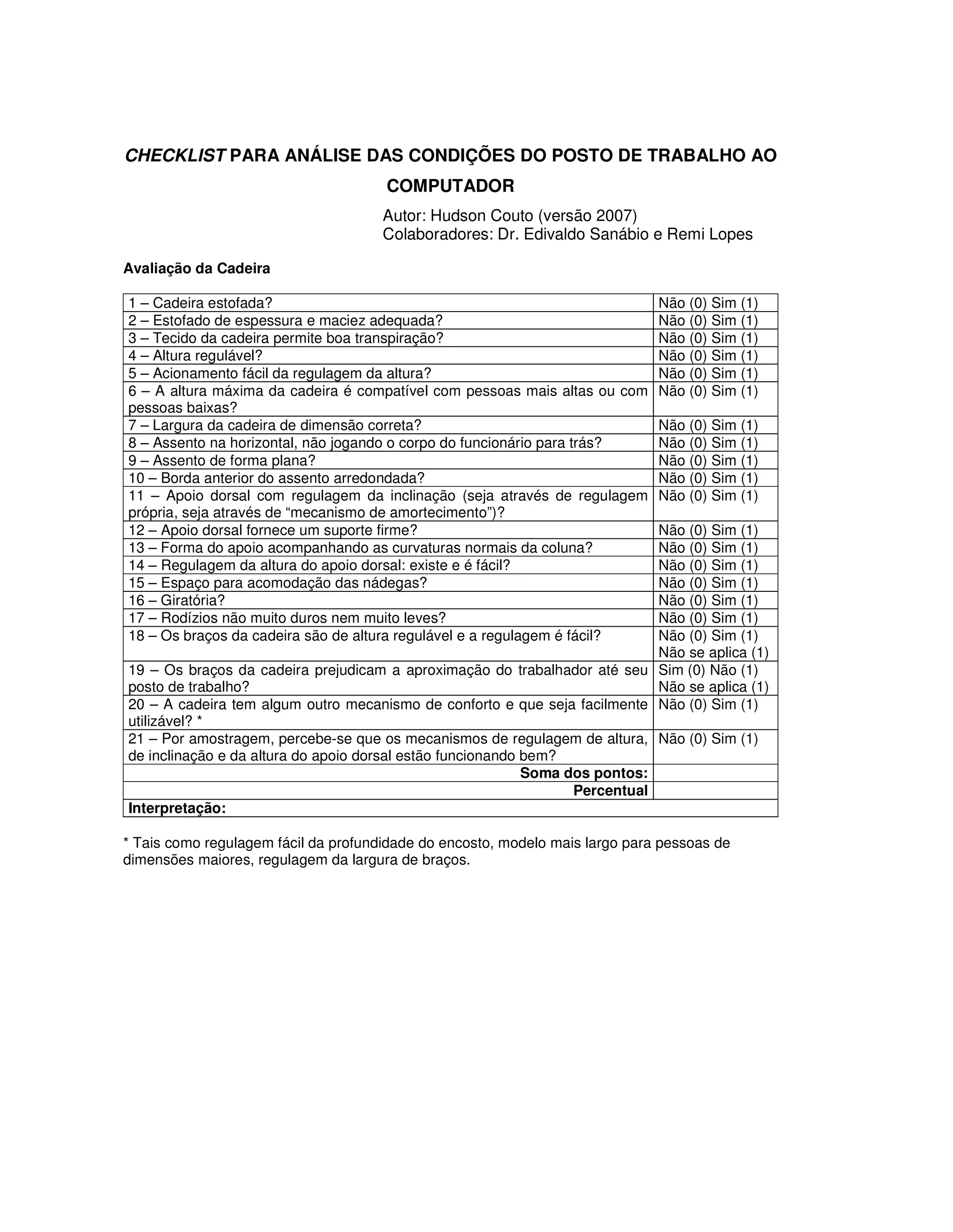 O documento apresenta um checklist para análise das condições do posto de trabalho ao computador, avaliando itens como cadeira, mesa, suporte para teclado, apoio para os pés, porta-documentos, teclado, monitor, gabinete, notebook, interação, iluminação e sistema de trabalho. O checklist verifica aspectos ergonômicos como regulagem de altura, inclinação, dimensões, materiais, pausas e níveis sonoros e de iluminação.