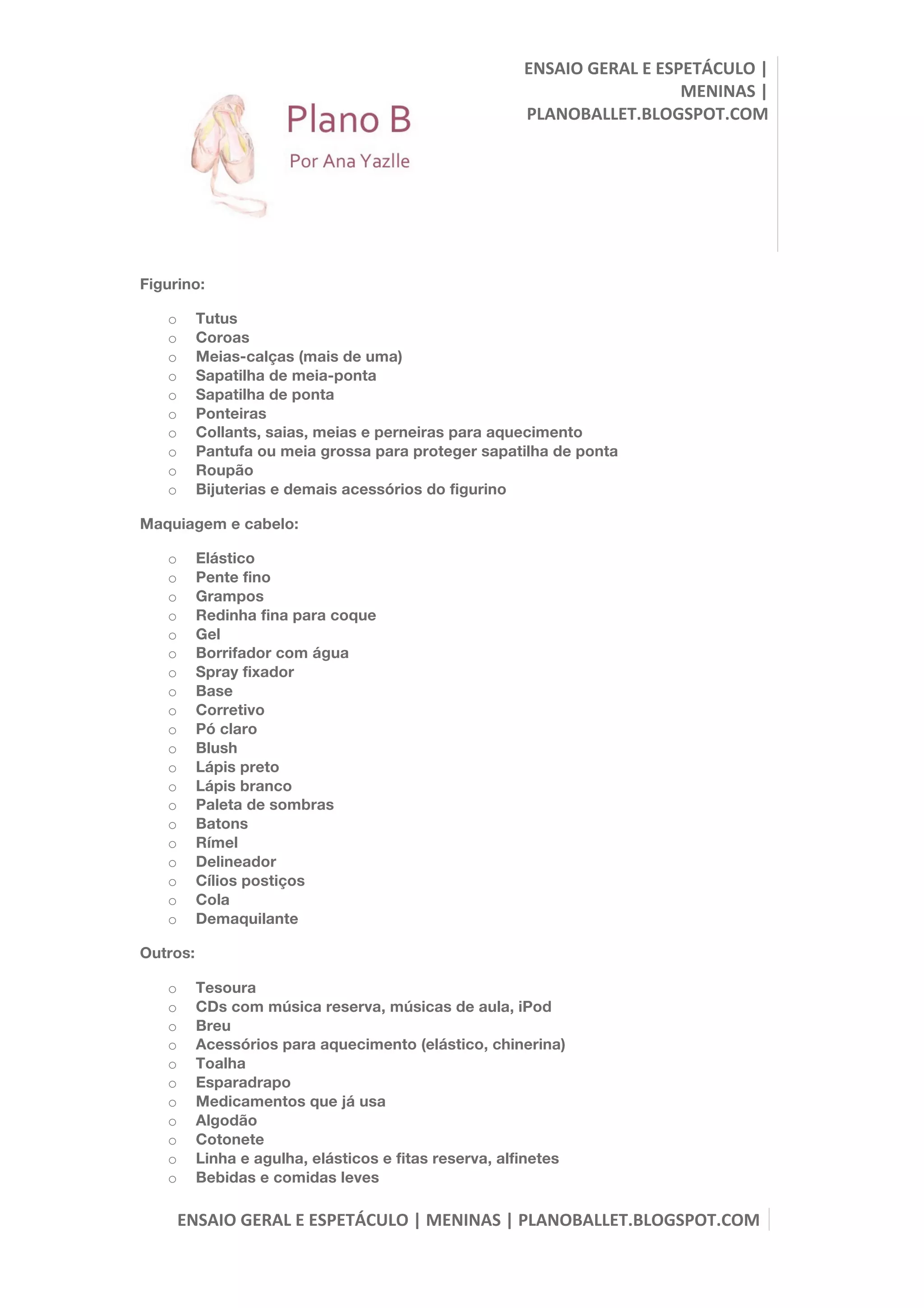 O documento lista os itens necessários para as meninas de balé no ensaio geral e espetáculo, incluindo figurinos como tutus e coroas, maquiagem e acessórios para cabelo, e outros itens como música, primeiros socorros e alimentos leves.
