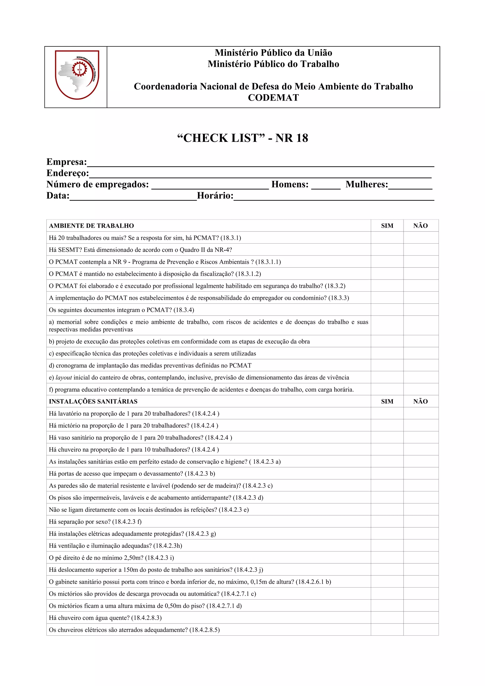 Este documento é um checklist para inspeção de conformidade com a Norma Regulamentadora NR 18 em uma obra de construção civil. Ele verifica aspectos como a existência de Programa de Controle Médico de Saúde Ocupacional e de Programa de Prevenção de Riscos Ambientais, condições das instalações sanitárias, vestiários, alojamentos e refeitórios, medidas de proteção em escavações, fundações e outras atividades de alto risco.
