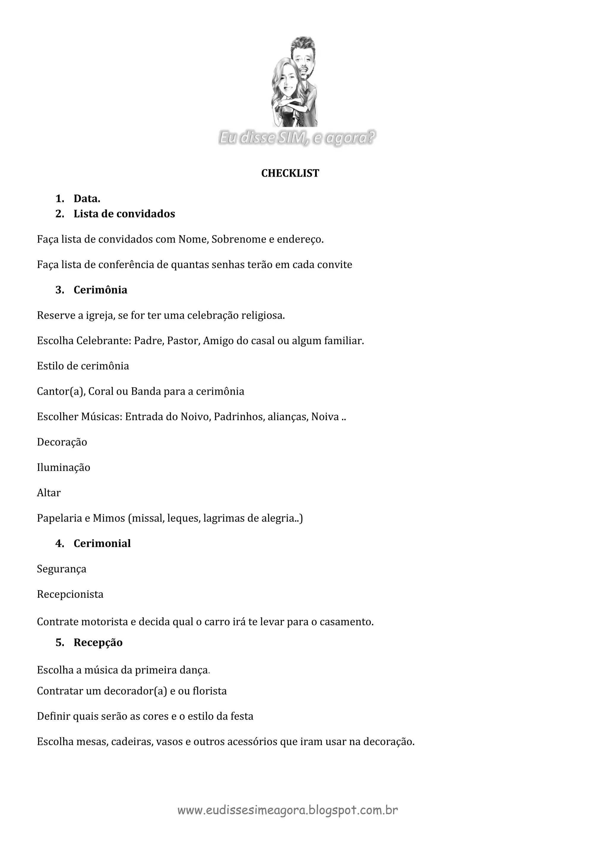 O documento fornece uma lista de tarefas para planejamento de casamento, incluindo escolha de local da cerimônia, convidados, decoração, roupas, buffet, entretenimento, documentos legais e lua de mel.