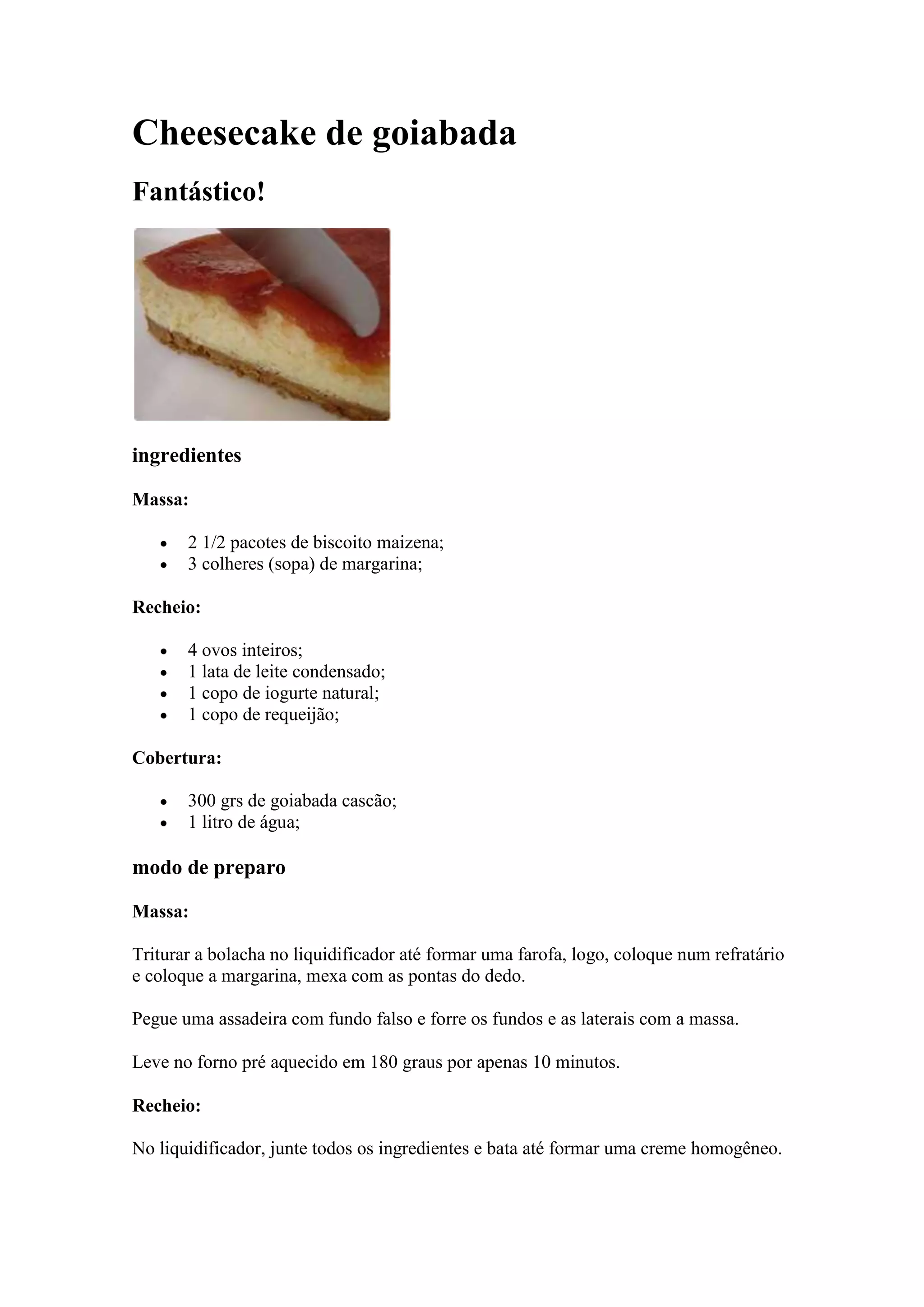O documento fornece receitas para três tipos de macarrão: Cheesecake de goiabada, Macarrão de forno e Macarrão simples de forno. A receita de Cheesecake de goiabada inclui uma massa de biscoito maizena e margarina, um recheio de ovos e leite condensado e uma cobertura de goiabada em calda. A receita de Macarrão de forno inclui espaguete, molho de tomate, presunto e mussarela assados ao forno. A receita de Macarrão simple