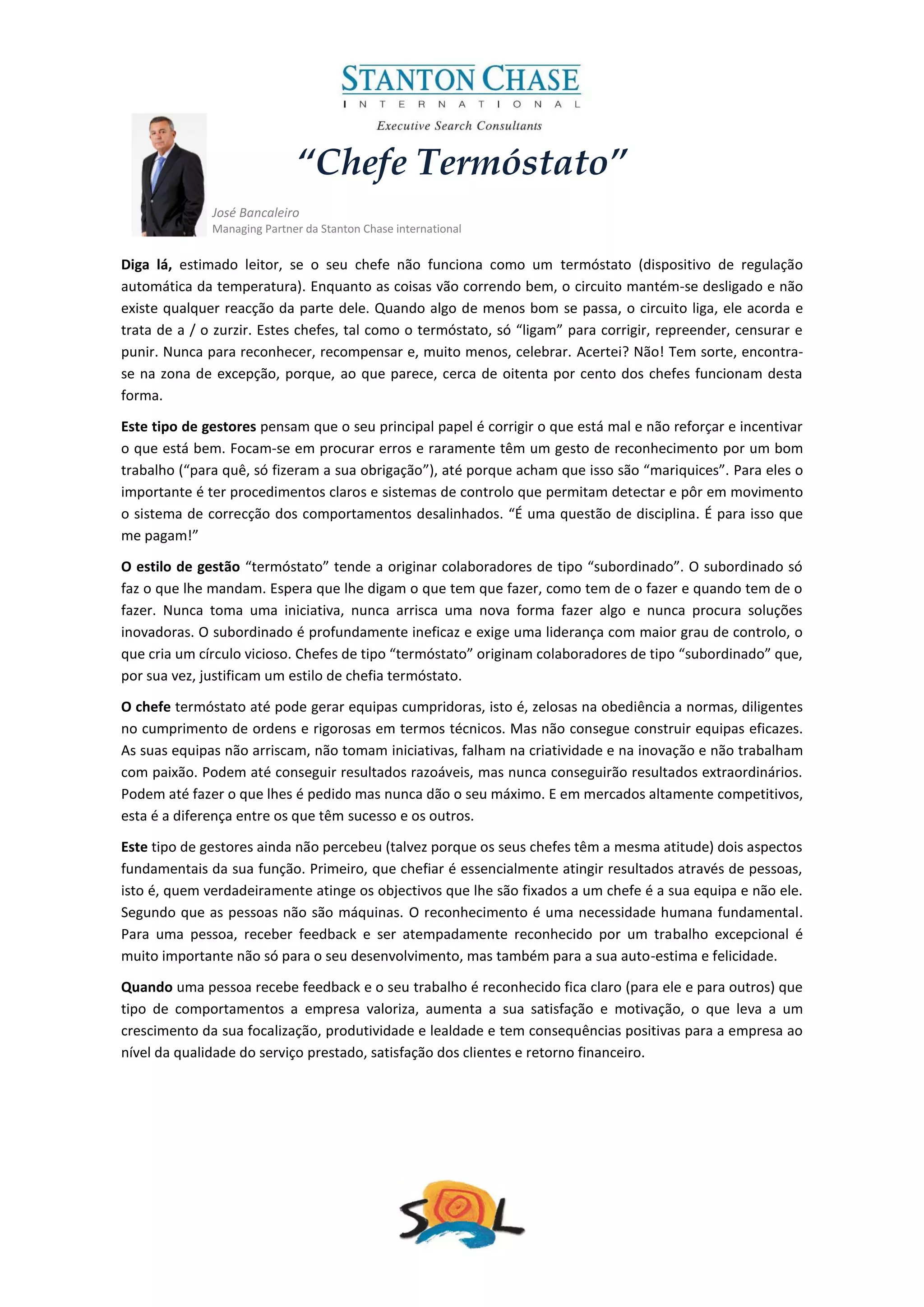 [1] O documento discute os problemas com chefes que funcionam como "termóstatos", apenas se focando em corrigir erros em vez de reconhecer bons trabalhos. [2] Esses chefes tendem a criar subordinados que só fazem o que são mandados sem inciativa. [3] Para ter sucesso, as empresas precisam de chefes que deem feedback e reconhecimento, motivando os funcionários a darem o máximo e conseguirem resultados extraordinários.
