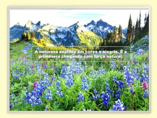 O documento descreve a chegada da primavera com a natureza explodindo em cores e alegria. As flores se abrem tingindo os campos de cores fortes após o inverno. A primavera é a estação das flores, do amor e da beleza que renova a natureza e desperta as paixões.