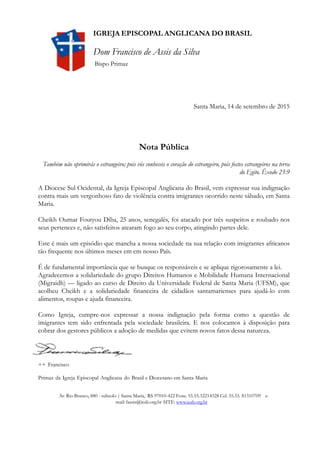A Diocese Sul Ocidental, da Igreja Episcopal Anglicana do Brasil, vem expressar sua indignação