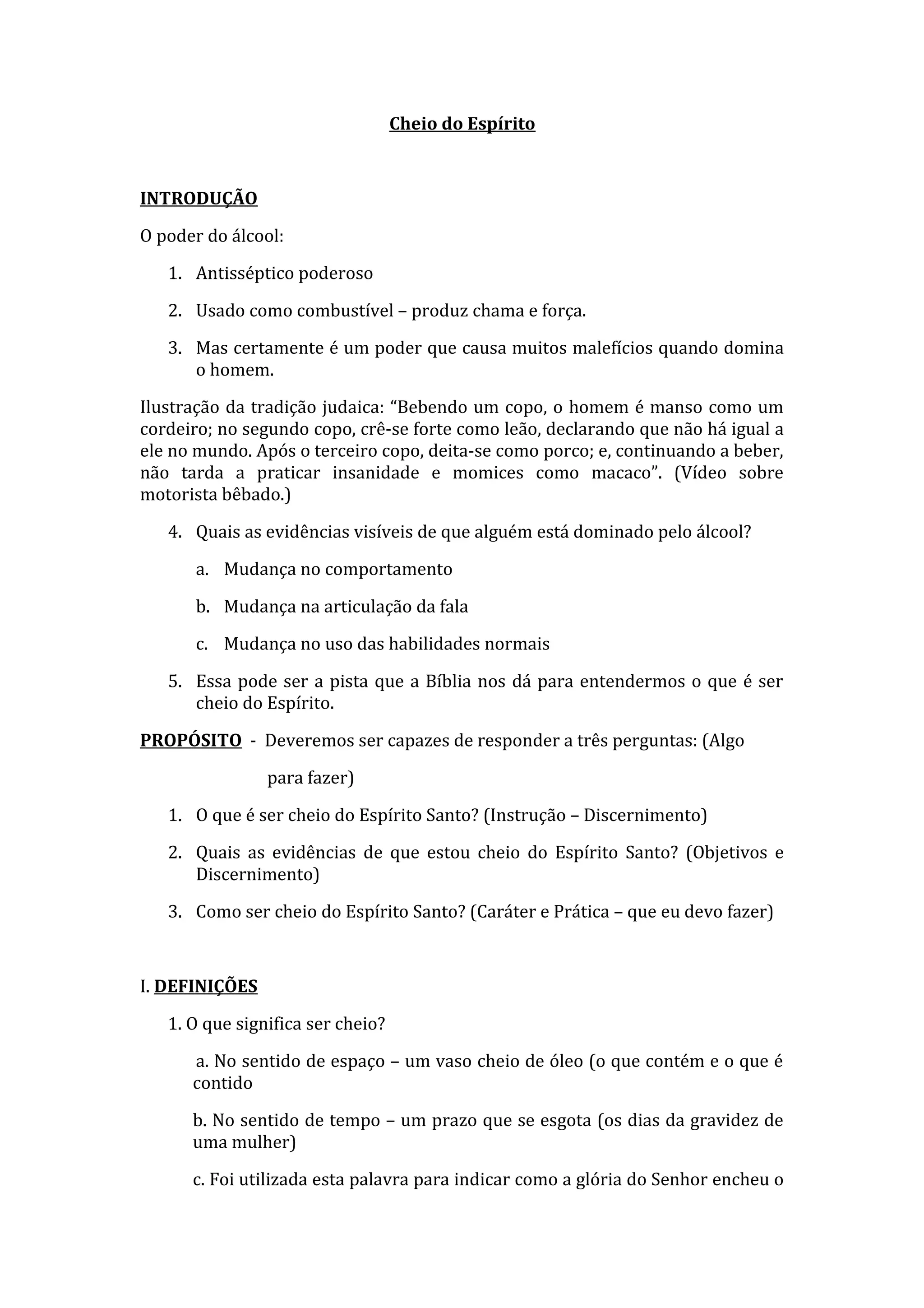 O documento discute o que significa ser "cheio do Espírito Santo" comparando-o com os efeitos do álcool no corpo. Explica que ser cheio do Espírito envolve ter um relacionamento com Deus e receber Seu poder, e algumas evidências disso incluem mudanças no comportamento, fala e habilidades que manifestam mais as coisas de Deus. Também discute como cultivar intimidade com Deus por meio da oração e obediência para ser capaz de receber o enchimento do Espírito.