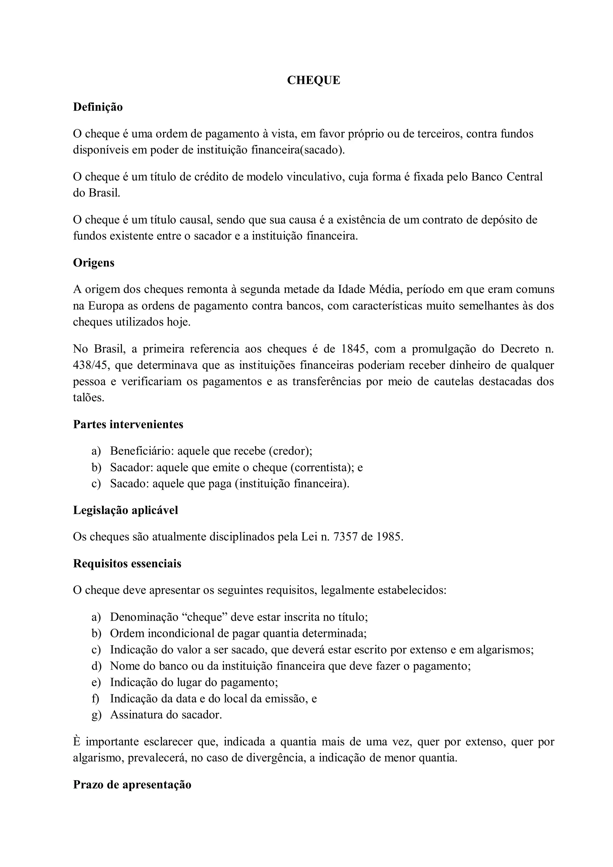 O cheque é uma ordem de pagamento contra fundos disponíveis em instituição financeira. Pode ser emitido pelo correntista (sacador) a favor de si mesmo ou de terceiros (beneficiário), devendo ser pago pela instituição (sacado) de acordo com requisitos legais. Existem diferentes tipos de cheques, como ao portador, nominal, cruzado ou turismo.
