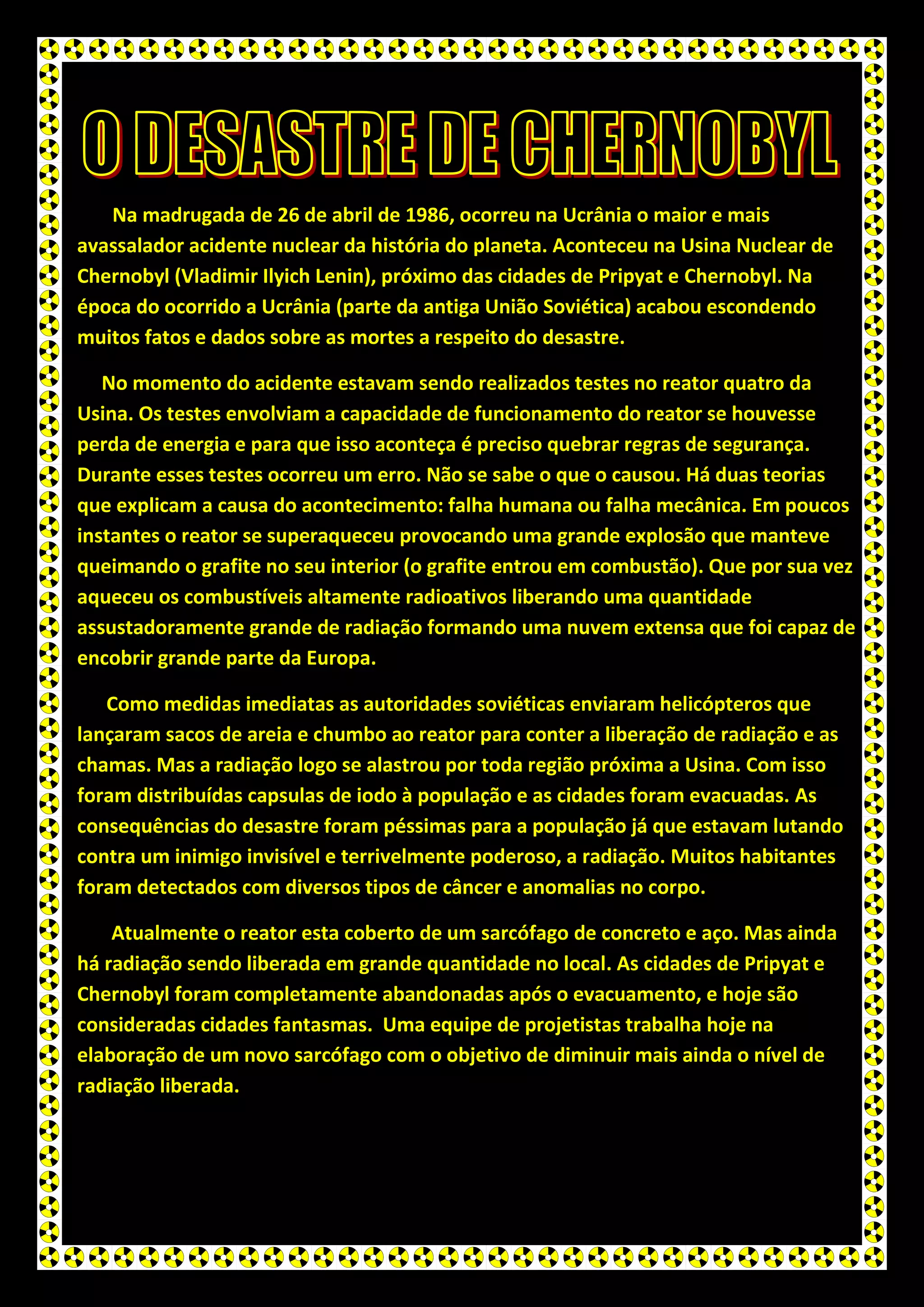 O maior acidente nuclear da história ocorreu na Usina Nuclear de Chernobyl na Ucrânia em 1986 durante testes de segurança, causando uma explosão e liberação de radiação que contaminou uma grande parte da Europa e forçou a evacuação das cidades próximas.