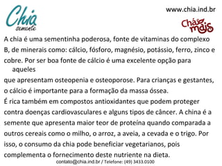 A chia é uma semente rica em vitaminas, minerais e compostos antioxidantes, sendo benéfica para a saúde óssea e cardiovascular. Seu consumo pode ajudar na perda de peso e no funcionamento intestinal devido ao alto teor de fibras. A chia pode ser utilizada de várias formas na alimentação, com uma dose recomendada de 1 a 2 colheres de sopa por dia.