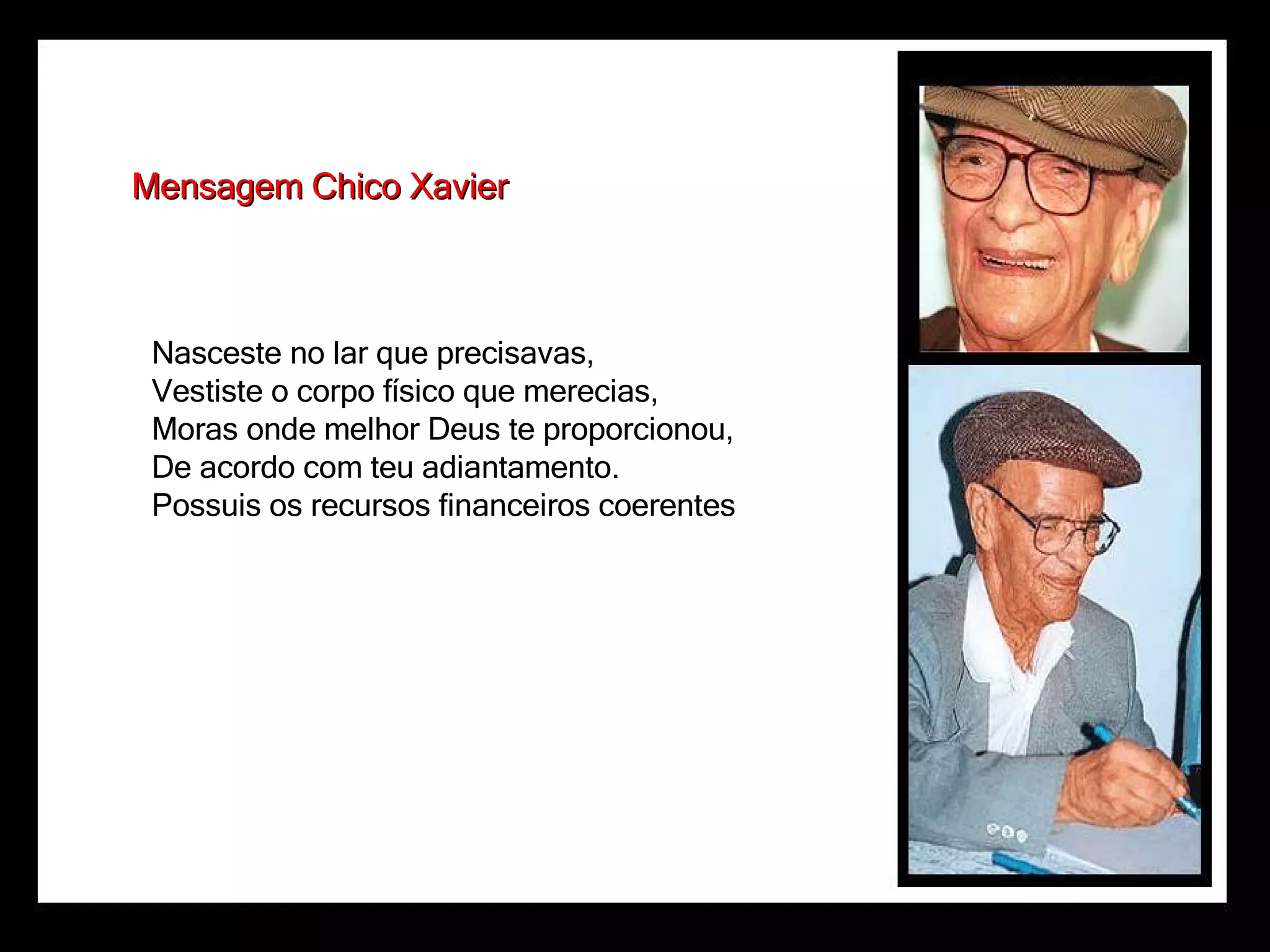 A mensagem de Chico Xavier afirma que cada pessoa está onde merece estar de acordo com seu desenvolvimento espiritual, e que possui os recursos necessários para suas lutas. Nossas escolhas, pensamentos e vontade moldam nossas vidas, então não devemos reclamar nem nos vitimizar, mas sim analisar e mudar nossos objetivos para buscar o bem. Embora não possamos mudar o passado, podemos começar um novo futuro a qualquer momento.