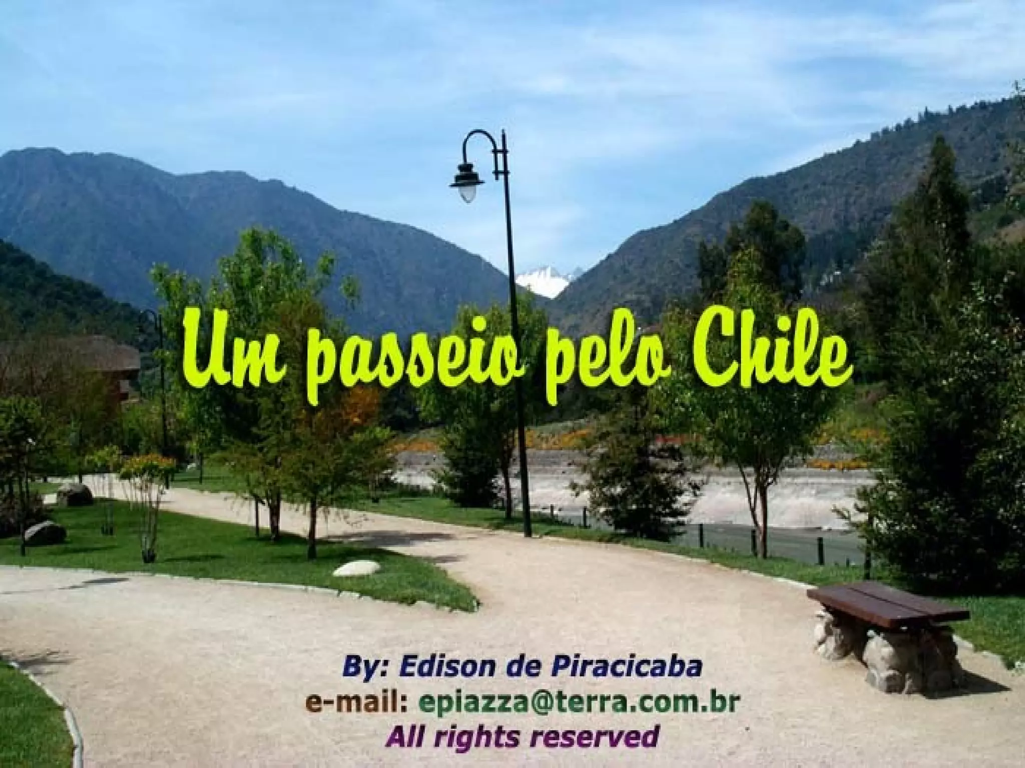 O documento descreve as belezas naturais e culturais do Chile, incluindo suas cidades, paisagens, vinhedos e tradições. Santiago é destacada como uma das capitais mais modernas da América do Sul. O documento também promove o turismo no Chile, convidando o leitor a visitar e desfrutar da hospitalidade chilena.