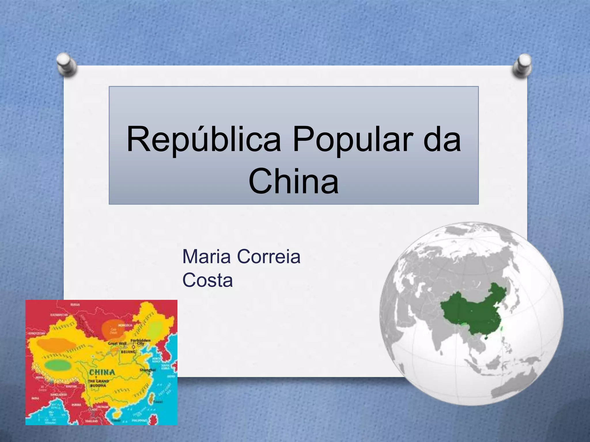 A República Popular da China é um grande país asiático com paisagens variadas que incluem florestas subtropicais e montanhas. O famoso panda gigante é encontrado apenas ao longo do rio Yangtzé e a capital Pequim é famosa pela Cidade Proibida construída no século XV.
