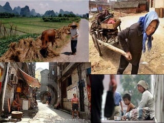 O documento discute a população e economia da China. Ele descreve como a política de filho único levou a desequilíbrios de gênero e como a taxa de crescimento populacional está diminuindo. Também aborda a transição da China de uma economia agrícola para uma economia industrial e de exportação, impulsionada por reformas capitalistas sob controle do Partido Comunista.