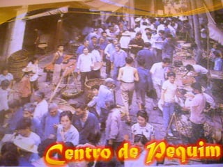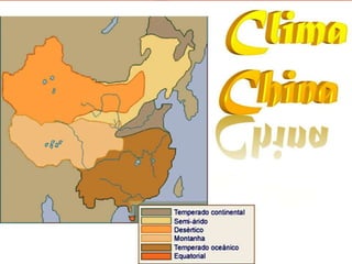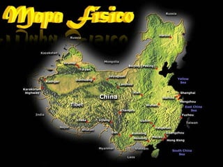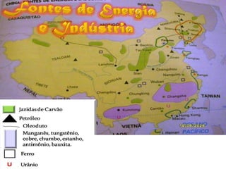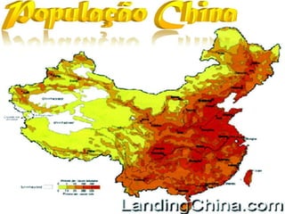Este documento fornece informações sobre a China, incluindo sua área de 9.596.961 km2, população de 1.305.200.000 habitantes e capital Pequim. Detalha as principais atividades agrícolas e industriais do país, bem como seus recursos naturais como petróleo e carvão.