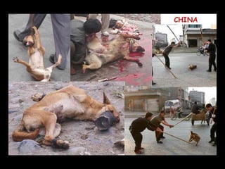 O documento descreve as políticas cruéis da China de limitar natalidade a um filho por família e os métodos usados para forçar abortos e abandonar crianças. Também descreve a tortura e maus-tratos de animais na China, incluindo esmagar gatos e cachorros com saltos agulha e manter ursos em gaiolas pequenas demais. Pede um boicote às Olimpíadas de 2008 na China em protesto a essas crueldades.