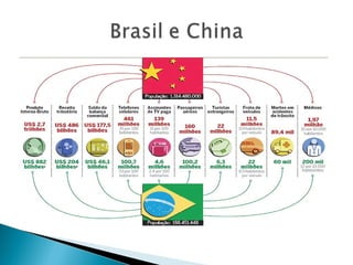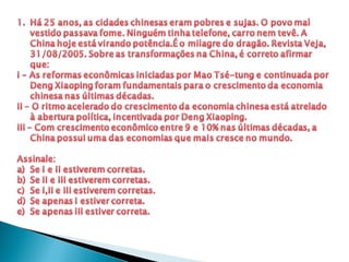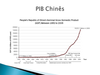 O documento descreve a ascensão econômica da China comercial após as reformas de mercado iniciadas na década de 1980, que levaram a um crescimento recorde de 18% em 1992 e à transformação da China em uma potência econômica global, embora com desigualdades regionais.
