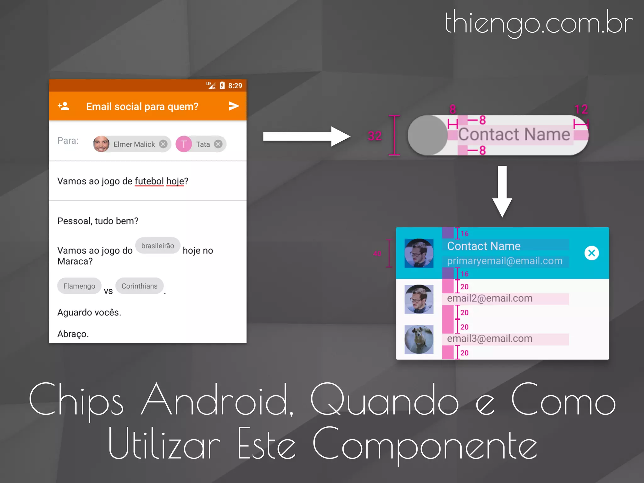 O documento explica o uso do componente 'chip' em aplicativos Android, descrevendo suas características, contextos de aplicação e especificações de design. Ele aborda a falta de uma API nativa até o momento e sugere o uso da biblioteca 'materialchipsinput' como uma solução viável. Além disso, são mencionadas as limitações da API e o potencial de melhoria na experiência do usuário ao incorporar o componente chips.