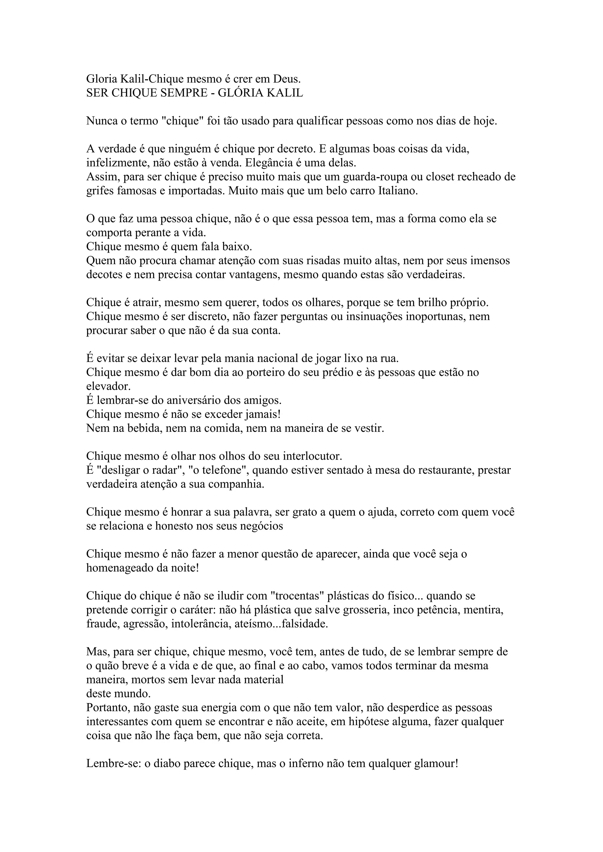 Gloria Kalil-Chique mesmoé crer em Deus.SER CHIQUE SEMPRE - GLÓRIA KALILNunca o termo \"